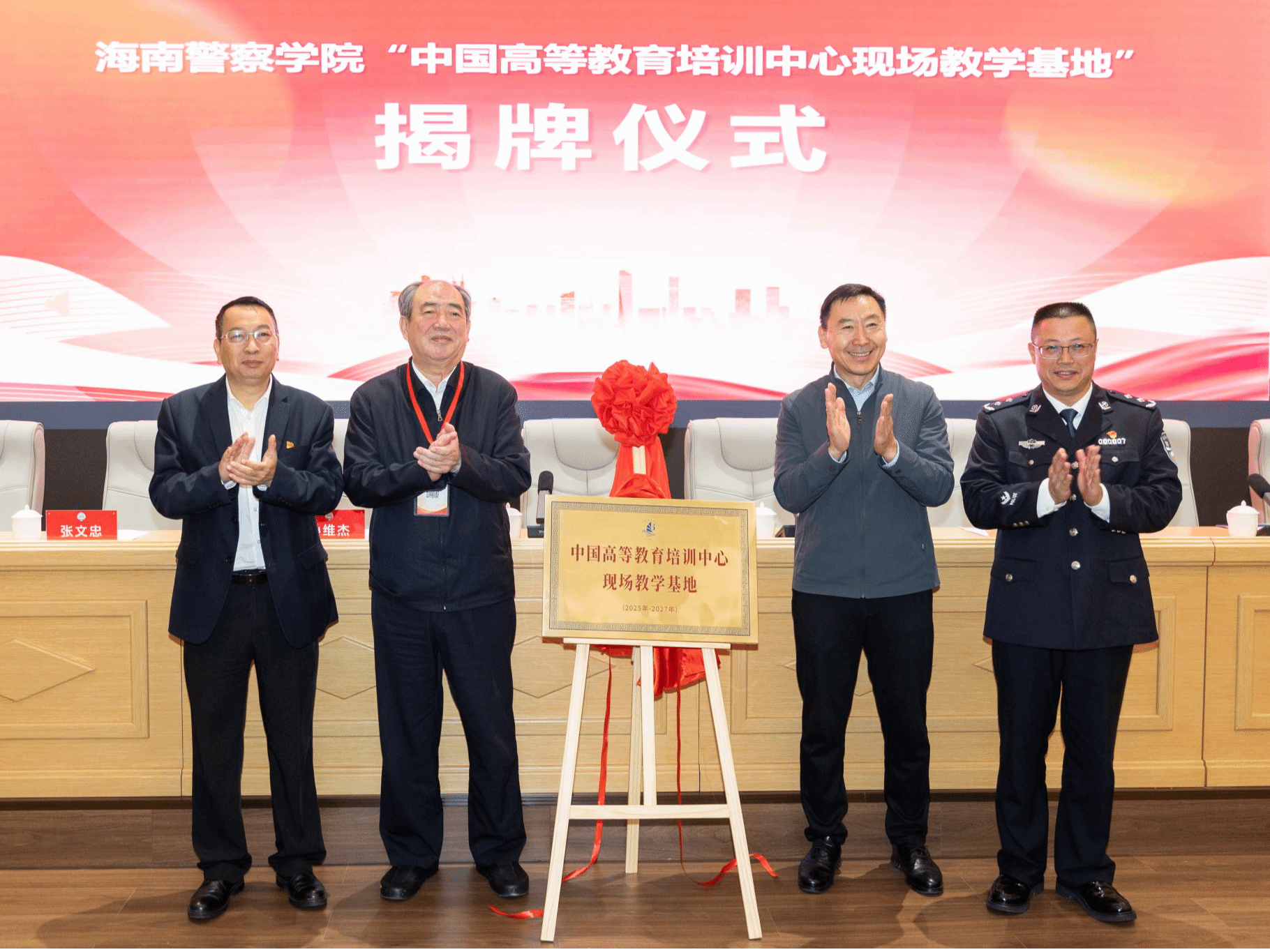 揭牌仪式上,中国高等教育学会副会长、中国高等教育培训中心主任姜恩来,中国高等教育学会副会长、中国高等教育培训中心书记孙维杰,海南警察学院党委书记庄才德和海南省公安厅副厅长、海南警察学院院长张文东共同为教学基地揭牌。该基地的落成,将推动培训资源与地方实践深度融合,助力海南国际教育创新岛、智慧教育岛和法制岛建设。