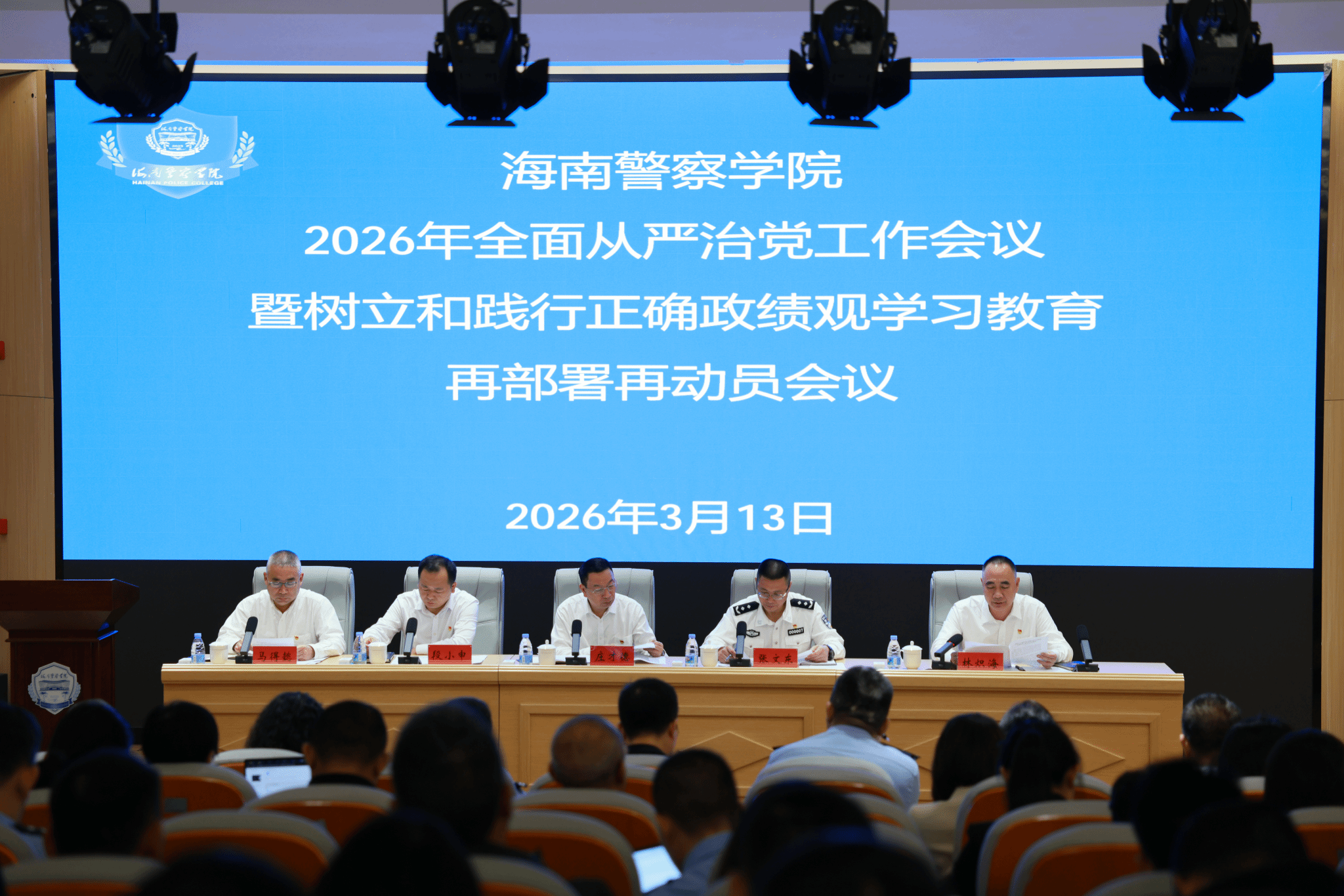 3月13日上午,海南警察学院召开2026年全面从严治党工作会议暨树立和践行正确政绩观学习教育再部署再动员会议。学院党委书记庄才德出席会议并讲话,学院党委副书记、院长张文东主持会议。