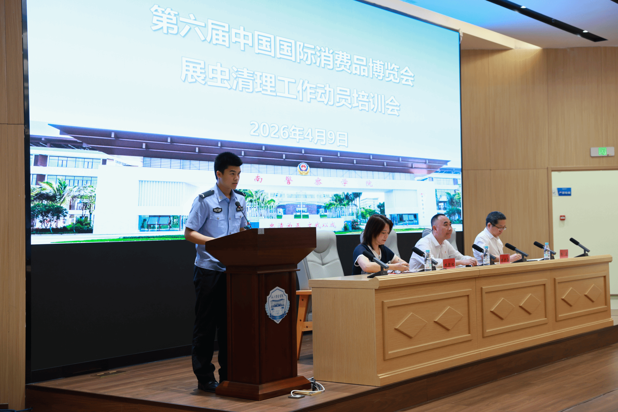 4月9日,第六届消博会“展虫”清理工作动员培训会在海南警察学院琴剑楼一楼报告厅举行。海南警察学院党委委员、副院长林炽海,海南国际经济发展局局长助理杨毅出席会议。会议由消博会“展虫”清理总指挥林朝阳主持,海南各高校师生等相关人员参加。