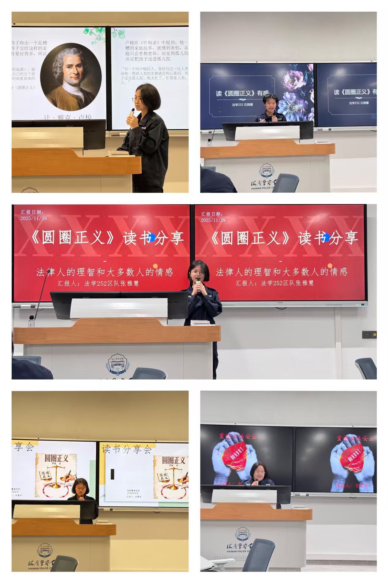 本次读书会选取的书籍为罗翔教授的《圆圈正义》,法学系魏子淇、吉思彤、石锦蕙、朱慧华、张雅慧等5位同学针对书籍主题展开了分享。吴佩芹表示,创办“海警法韵”读书会,旨在深入学习贯彻习近平文化思想,提升新时代青年学生的人文与专业素养,培养同学们良好的读书习惯,将读书作为提升完善法律知识、锻炼法律思维、提升综合法律素养的重要途径,营造书香校园氛围。同学们积极互动、踊跃发言,纷纷表示将以此次读书会为契机,精进专业知识,强化法治思维。